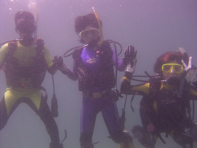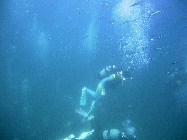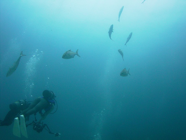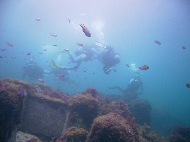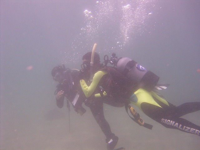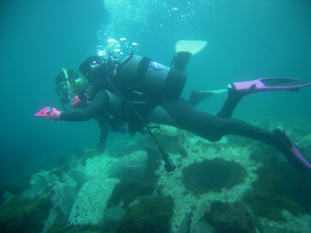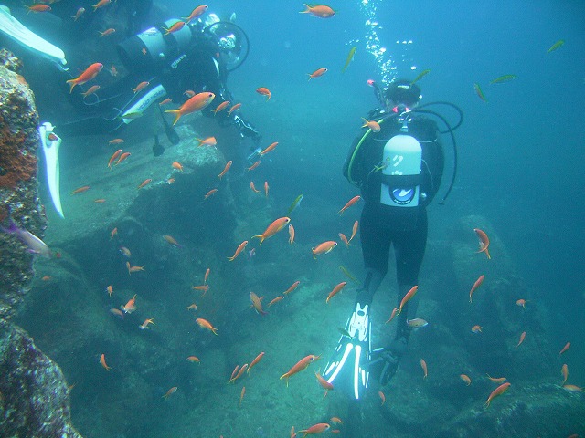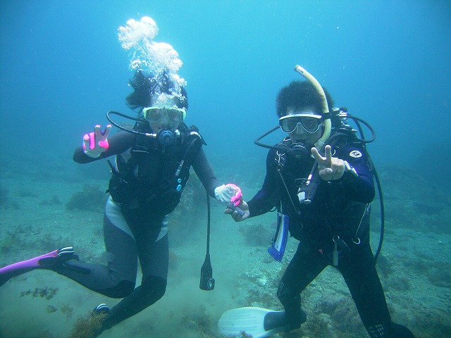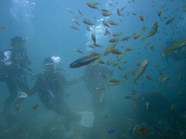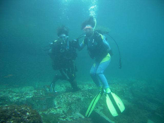 岩永ご夫婦、体験ダイビングお疲れ様でした。そして、講習中の早田さん、はたまたファンダイビングのまりっぺ・ゆうこちゃん・英子さん、真夏のような天気の中で気持ち良いゆったりダイビングで見も心もリラックス出来ましたね。とくに2本目は、湾を抜けてテトラポットの物凄い魚影にはびっくりしましたね。