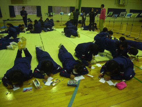 五島の海の様子をハイビジョンの映像や、パワーポイント、そして、環境問題についてのクイズ オリジナルのスライドなどで五島の海を感じて頂き、最後はオリジナルのポストカードに五島の海の素晴らしさを伝えるメッセージカードを作りました。 とっても積極的で、とっても真剣でとっても素敵な生徒さん達でした。 変える前に、中レディースのみなさんが作ってくれた魚中でポンを見学させて頂きました。 とっても素敵な空間でした