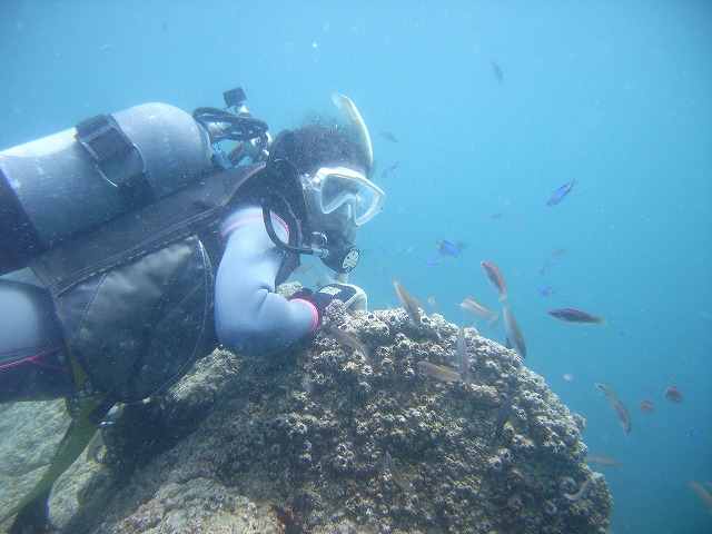 メジナの大群がいてダイバーに気がつくと、一斉に岩陰に入っていきました