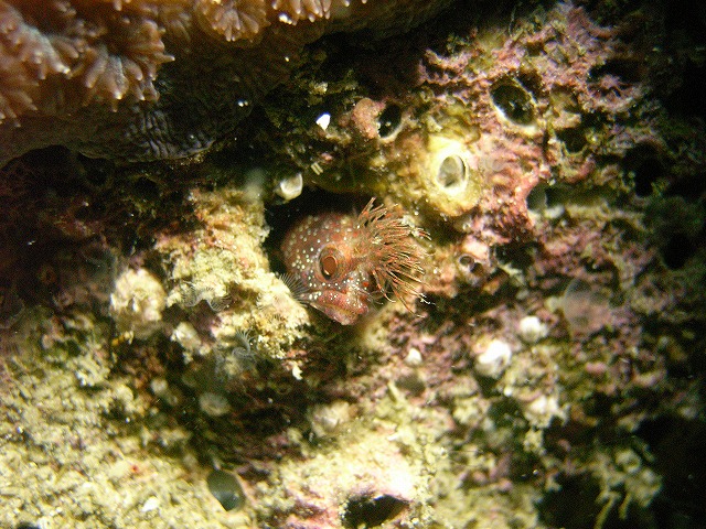 砂地まで降りて、ハマサンゴの根元にはカワイイコケギンポもいました