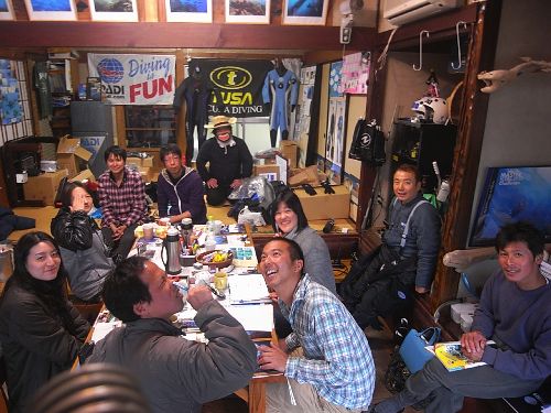 朝6時太古丸で青方港に到着後ショップに帰ってきた一行はモーニングを済ませて、今日のダイビングのゲストの方をお出迎えしました。 今日は、ボートで、元気になったまりすけさん、HIROさん、か~るさん、そして、参加予定ではなかったakkoさんとAOW講習のZ師さん てっちゃん・すぎちゃんで出かけました。 風が強くポイントは限定されましたが、それぞれ楽しんでこられました。ポンでは、テクニカルダイビングも行われました(O濱さんお疲れさまでした)・・・留守番は、宮きょん 原さん なっつんでした。 夕方は、I賀ちゃん パパ弁当屋君,ちーちゃんも遊びにきてくれました。