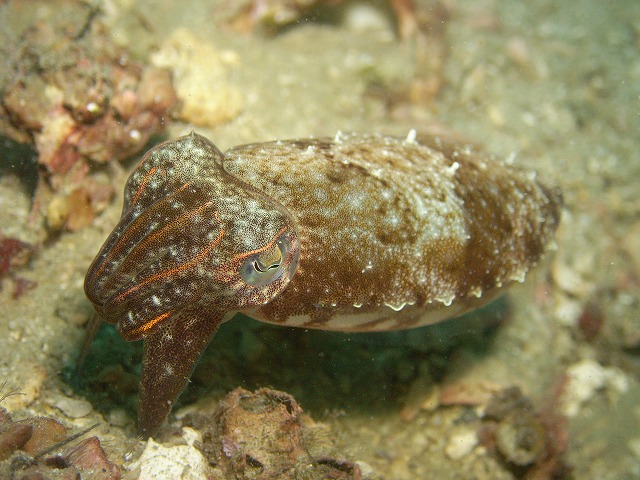 浮上開始しようとしたときに、岩に擬態しているコウイカの子供発見
