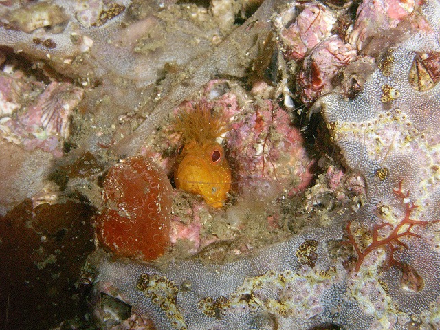 少しづつ深く潜っていくと、岩肌にコケギンポが居ました