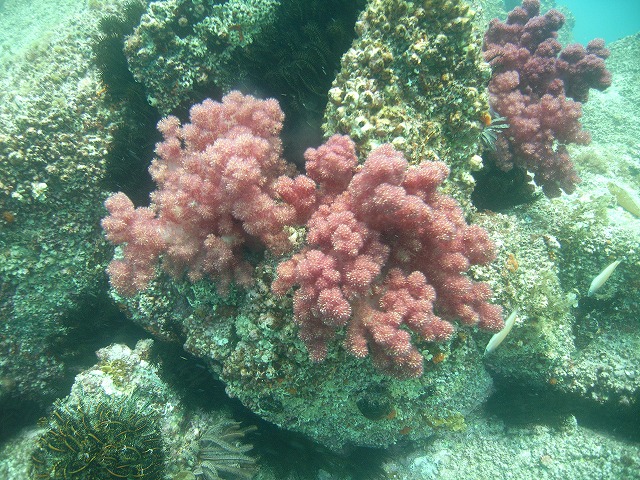 水底まで降りて行くと、人並みの大きさのソフトコーラルがあちらこちらに…