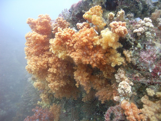 浅場の方へ移動して流れを避けて、ソフトコーラル、ハードコーラルが