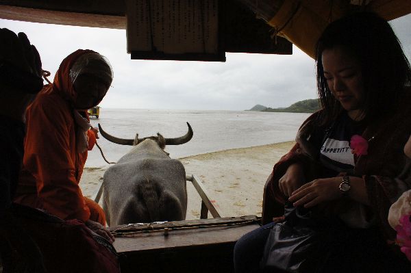 西表島ツアー最終日 今日は、午前中水牛(勇次郎くん)の引く車に乗って海を渡り由布島へ観光に行きました。 なんと、出かけるほんの少し前まで降っていた大雨が、ピタッと上がりました
