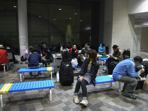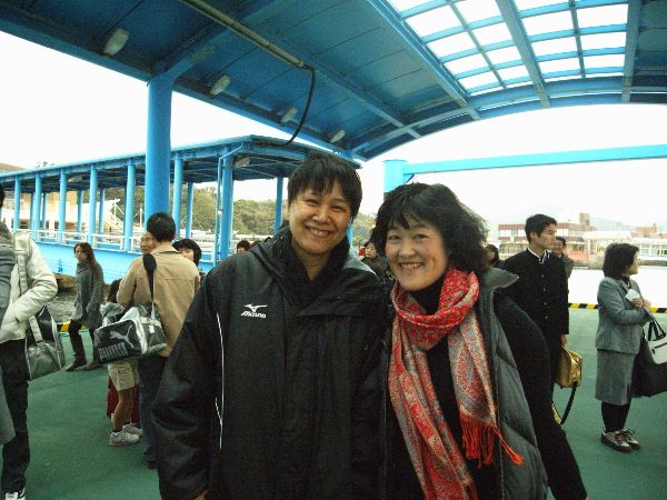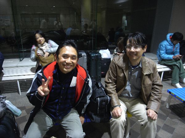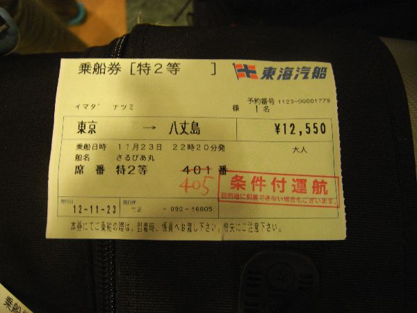 12時、福岡空港で今回のツアー参加者11名が集結 いざ、受付カウンタ ・・・・・・ そこで「羽田 八丈島間の飛行機が飛ぶかどうか・・・」耳を疑い、再度確認しましたが・・・やはり天候見合わせ中 でも、ここまで来たのだから「東京まで行ってみよう\(^O^)/・・・きっと飛ぶよ!・・・」 東京では、今回ツアー参加の入佐君合流で全員集結! でも、羽田空港で聞いた最終決定は「ANA829便欠航」 ・・・ それから、腹ごしらえをして(カールさんも一緒に夕食を住ませて)急遽スケジュール変更で竹芝桟橋からの船旅に全員で向いました。 もちろん海は時化(ドッバーン ザッブーン)覚悟の上でいざ八丈島 ・・・ここでまた、「条件付き出港」・・・これは、船が八丈島まで行って接岸出来ない場合はそのまま引き返すと言う事です。
