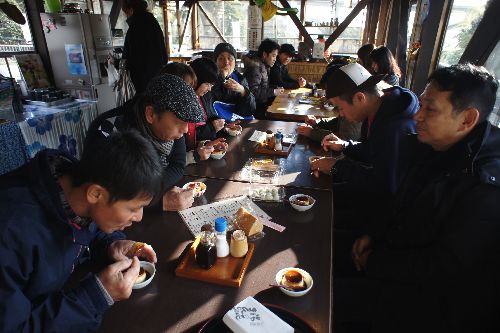 で、まずは腹ごしらえに行きました。ヒロト君おすすめの、市場の喫茶店(この店の鳥天が絶品、それにあつーいお味噌汁に入れたクロメはまるで納豆の様にどろ~ん・・・美味しかった +刺身に・小鉢それから、コーヒー&エリーゼがついて500円はビックリでした