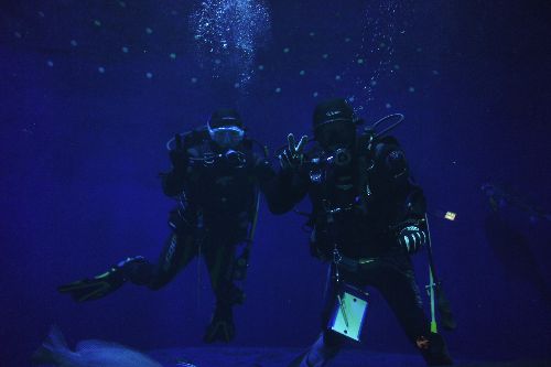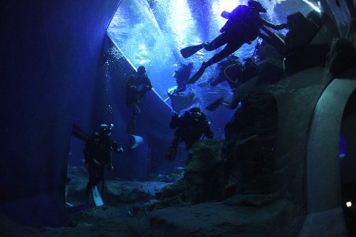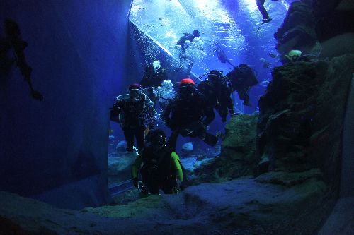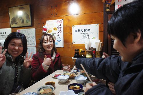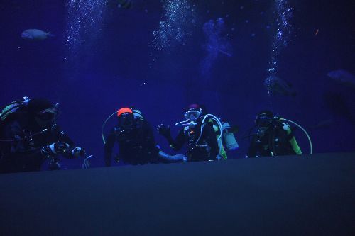 水中では、ドタブカ・ハンマーヘッドシャークやマダラトビエイ・マダラエイなどの大型の魚達をはじめ、ま~ 自然界ではなかなか会えない様なお魚さん達がた~くさん居ました。45分のダイビングを皆それぞれに満喫しました。 水槽の外では、家族旅行で大分に来ていたまりっぺ家族が手を振っていてくれました!ありがとう。 ダイビング後は、うみたまご館内をガイドつきで観覧・ショッピング。 うみたまごを満喫したところで。宿へ移動、入浴・・・そして今年1回目の新年会?!お食事タイム(このお店も良かった~ 創作料理&飲み放題でした。 一番は、豚骨スープでネギシャブ・・・お陰でお酒も進む進む![]()